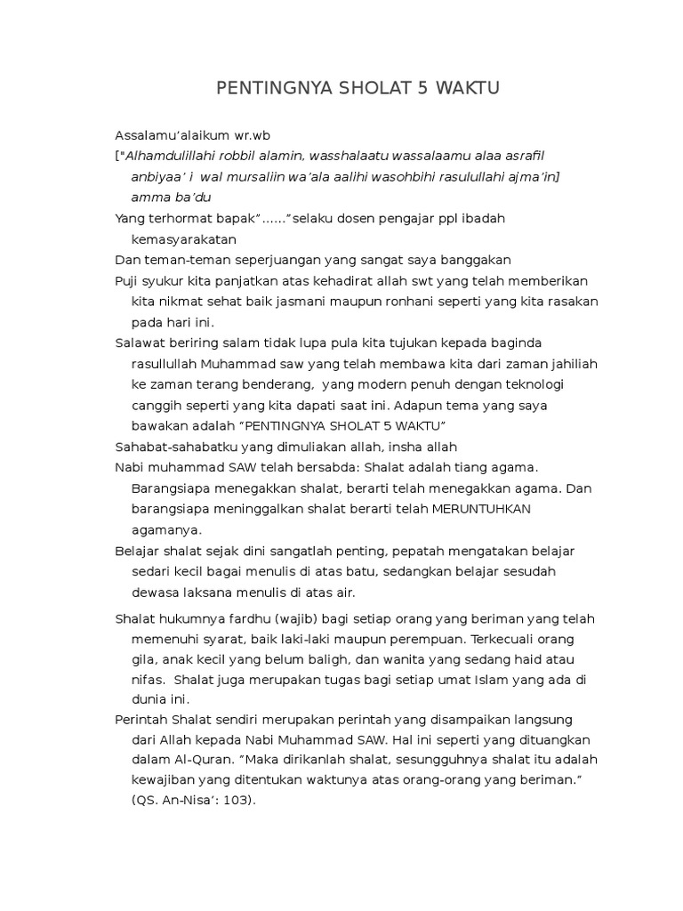Pentingnya Sholat 5 Waktu from imgv2-2-f.scribdassets.com Mulai belajar khusyu' dalam sholat yuk? Bisa dijadikan sebagai bahan pembelajaran mengenai sholat wajib (lima waktu). Shalat lima waktu terdiri dari : Mendirikan sholat 5 waktu dalam sehari semalam bagi seorang muslim merupakan kewajiban yang karena begitu pentingnya shalat maka shalat juga biasa disebut sebagai tiang agama artinya apa? Panduan tata cara bacaan shalat lengkap. Berikut jenis sholat sunnah rawatib, waktu pelaksanaan, bacaan niat, hingga salah satu keutamaannya melebihi dunia seisinya. Pentingnya sholat lima waktu tersebut juga pernah dijelaskan oleh ustadz abdul somad atau uas. Rahasia dibalik sholat 5 waktu | ustadz adi hidayat ustadz adi hidayat kajian islam official niat dalam shalat lima waktu menjadi penting bagi kaum muslimin.